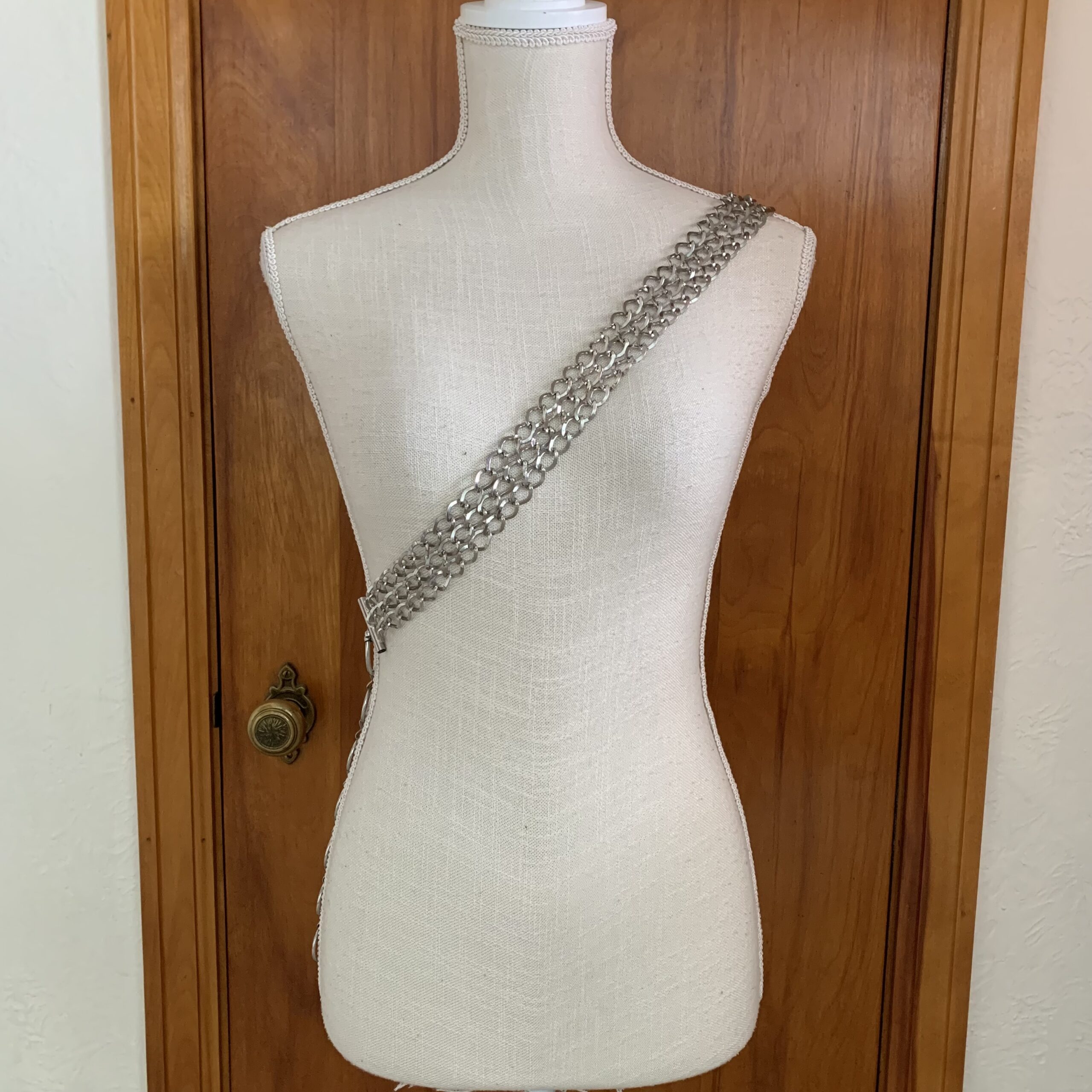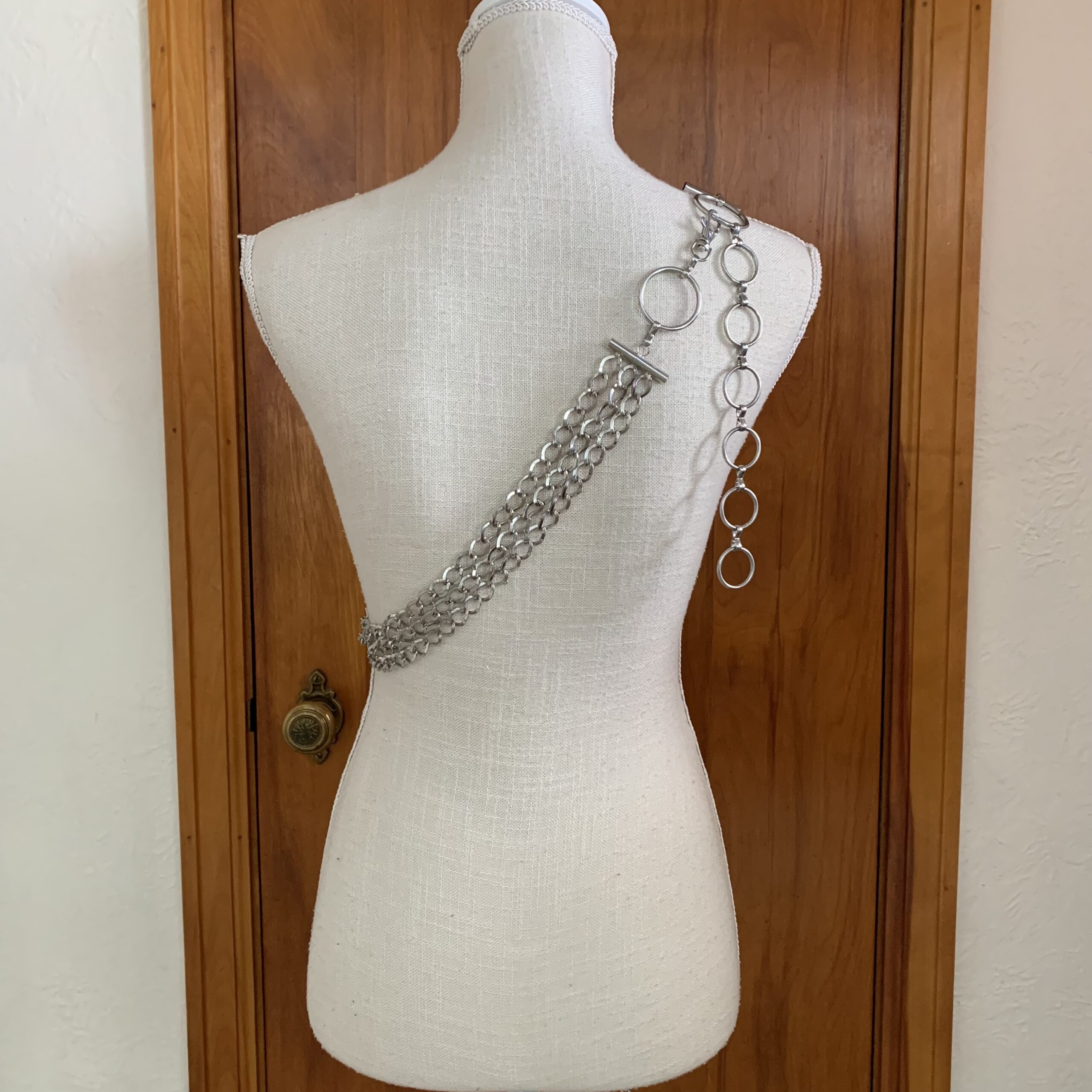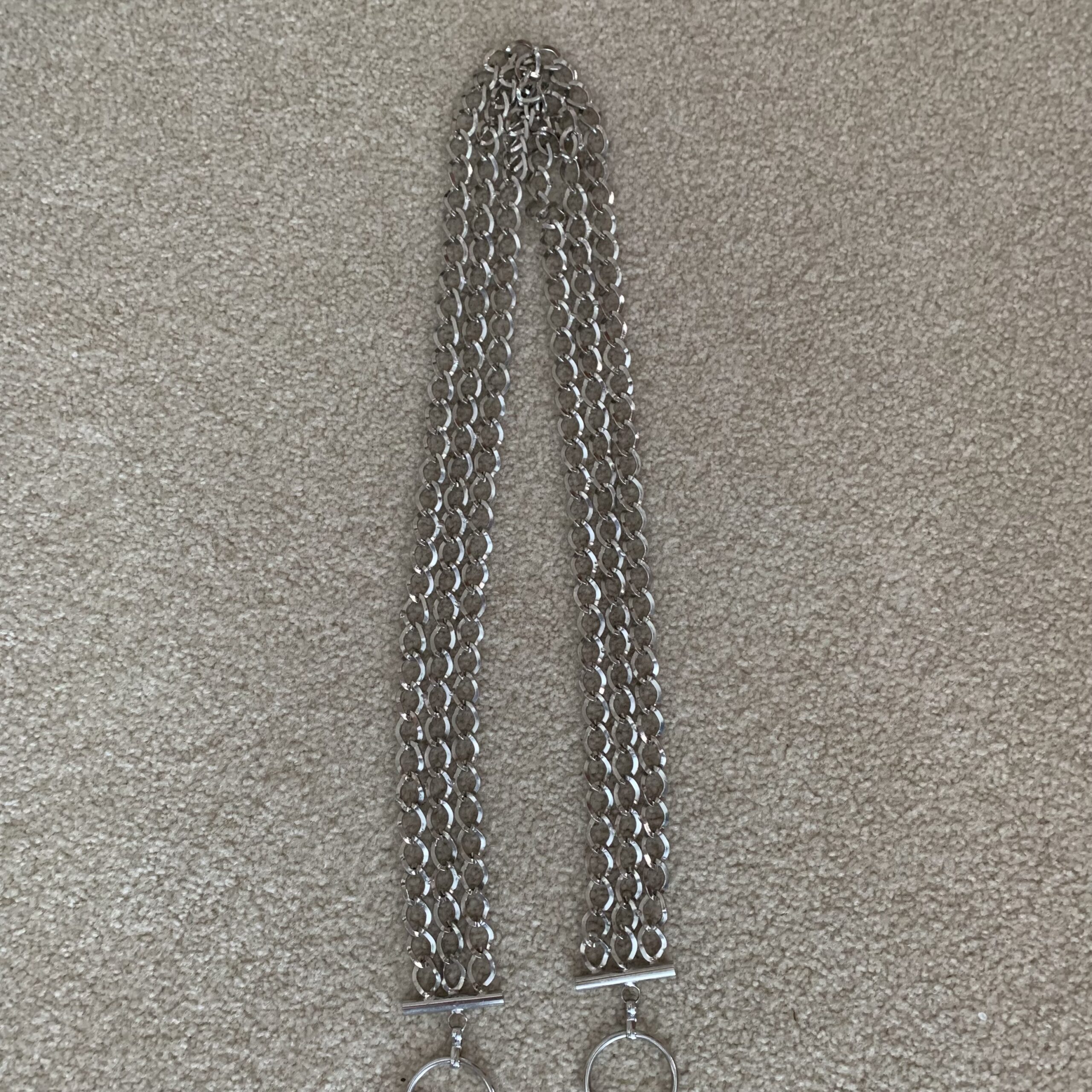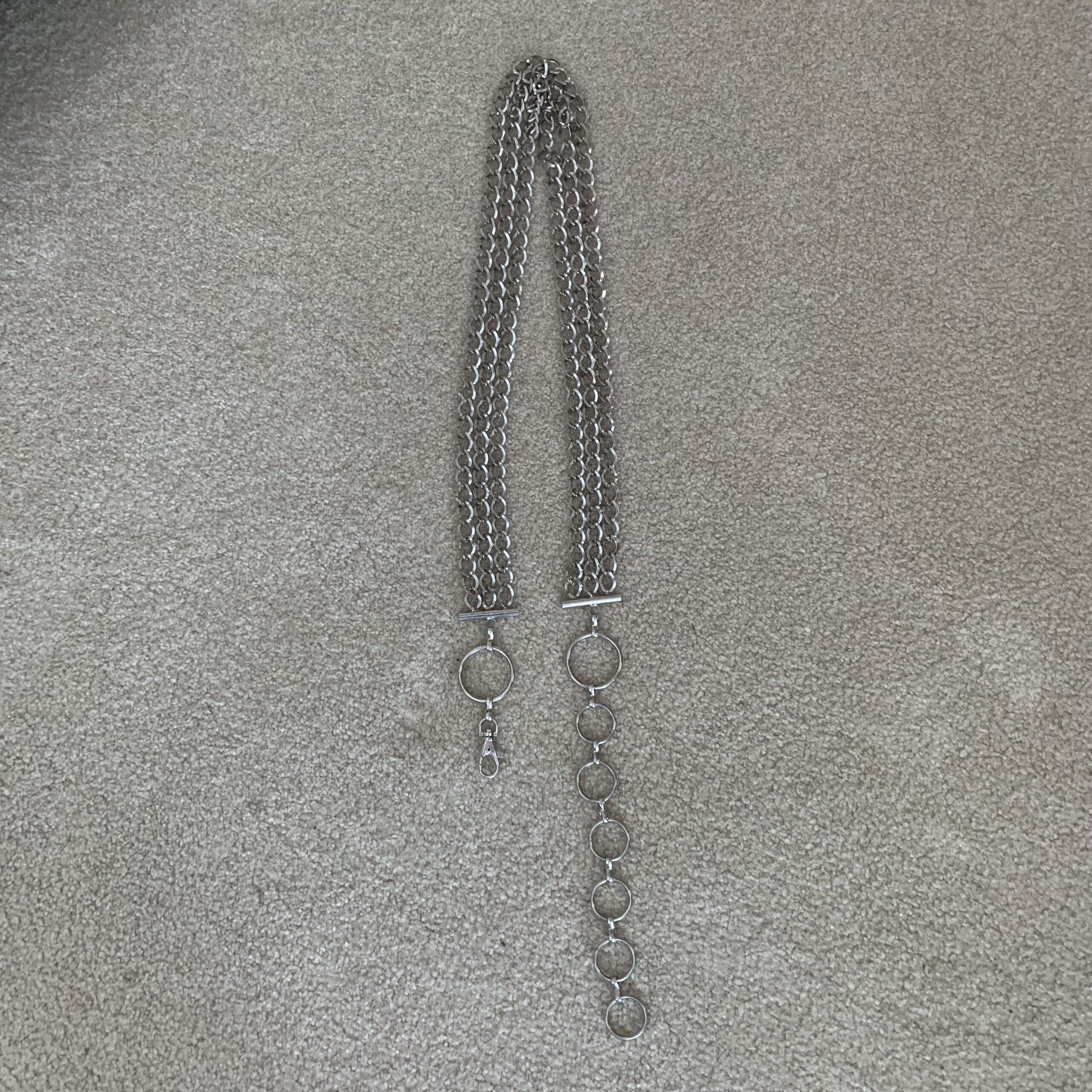 Measurements: approximately 48 inches in total length; chain section measures about 1.25 inches wide across the triple strands. Will fit a variety of sizes due to the O-rings attached.