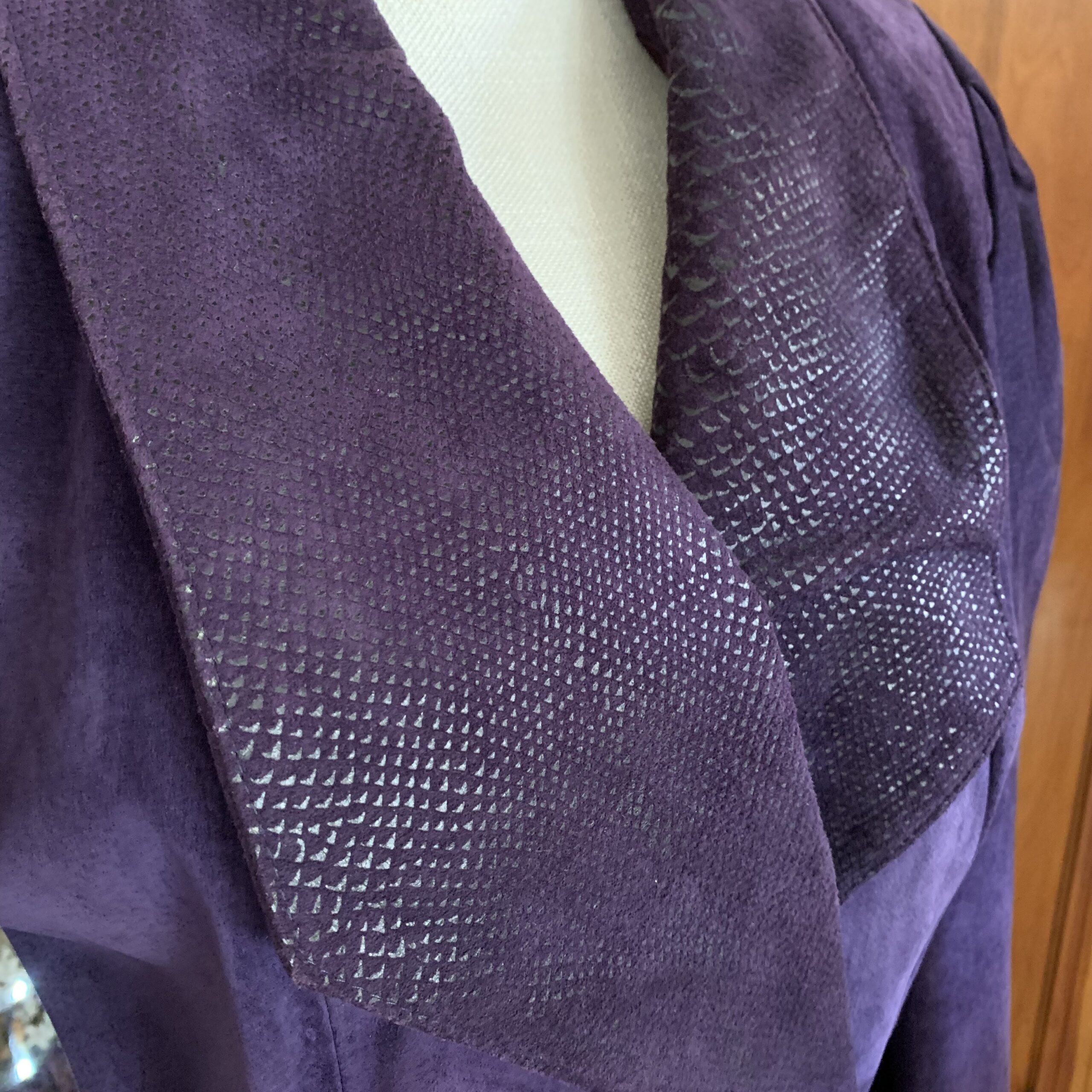 The unusual purple tone and restrained use of exotic-embossed leather elevate the piece beyond conventional leatherwear, placing it firmly within the language of power dressing rather than trend-based fashion. It is a jacket designed to command presence without spectacle.