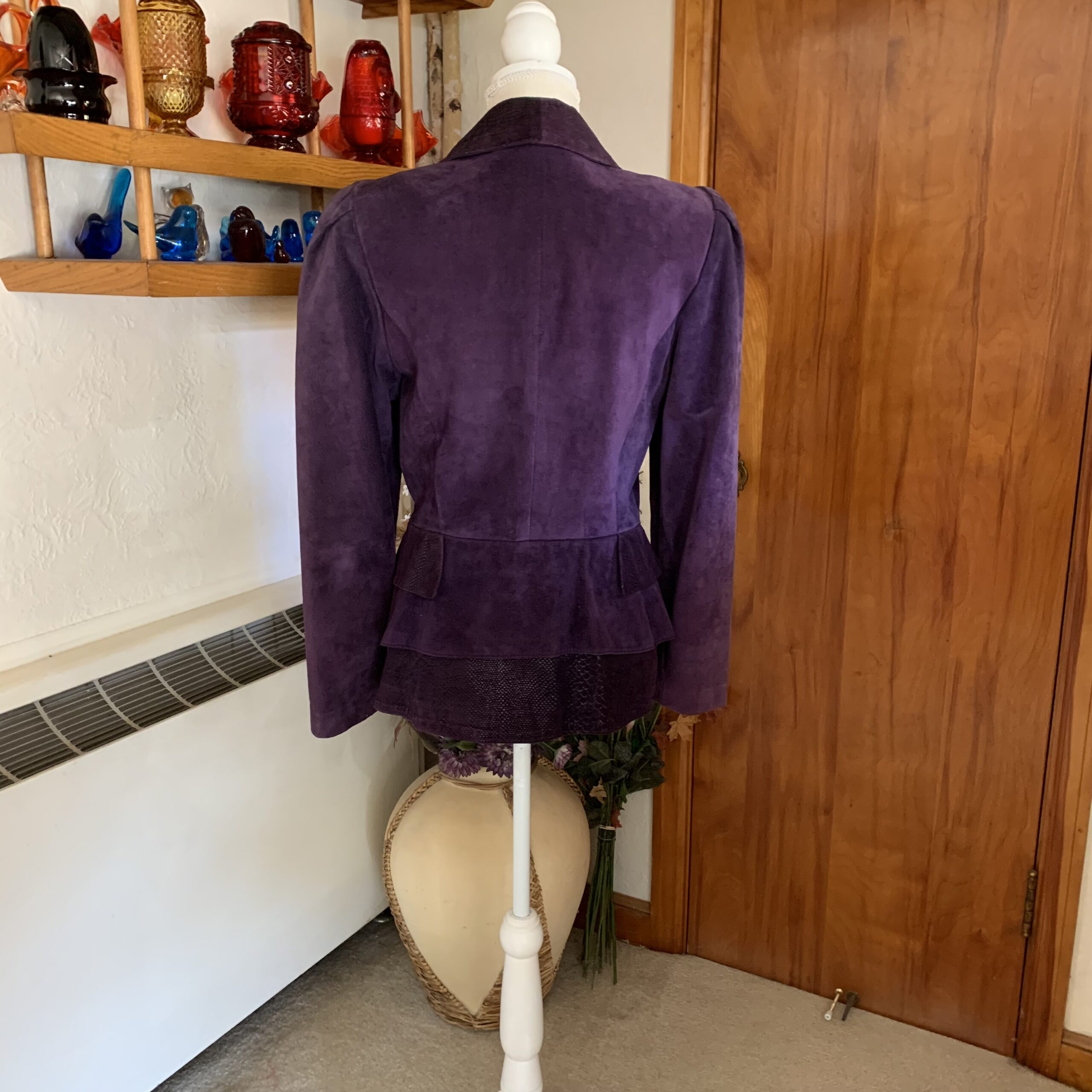 Sculptural late-1980s suede jacket by Danier, crafted in Canada and cut with a sharply defined power silhouette. Executed in deep aubergine purple suede, the jacket features strong structured shoulders, a nipped waist, and an angled cutaway front that creates a tailored, architectural line through the torso.