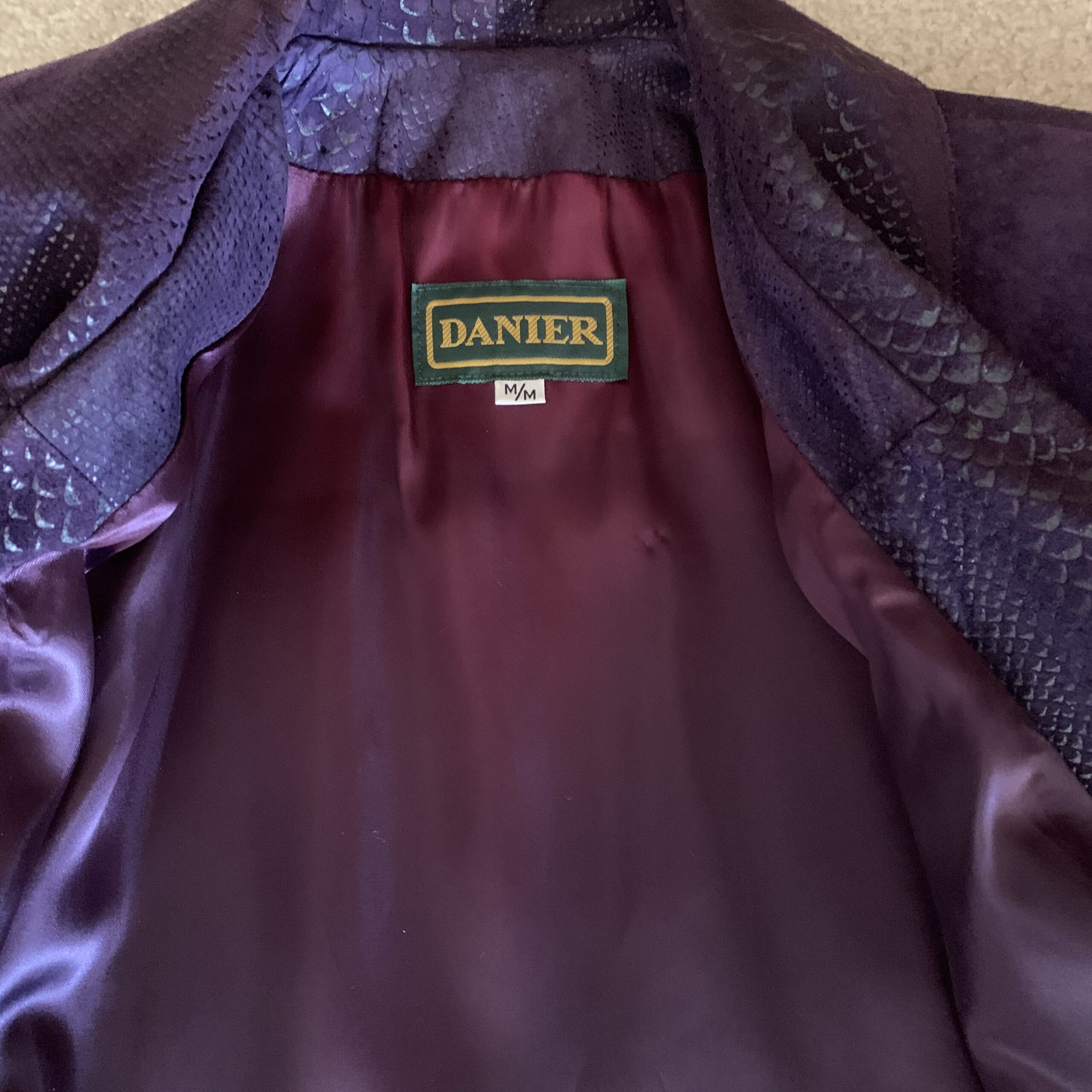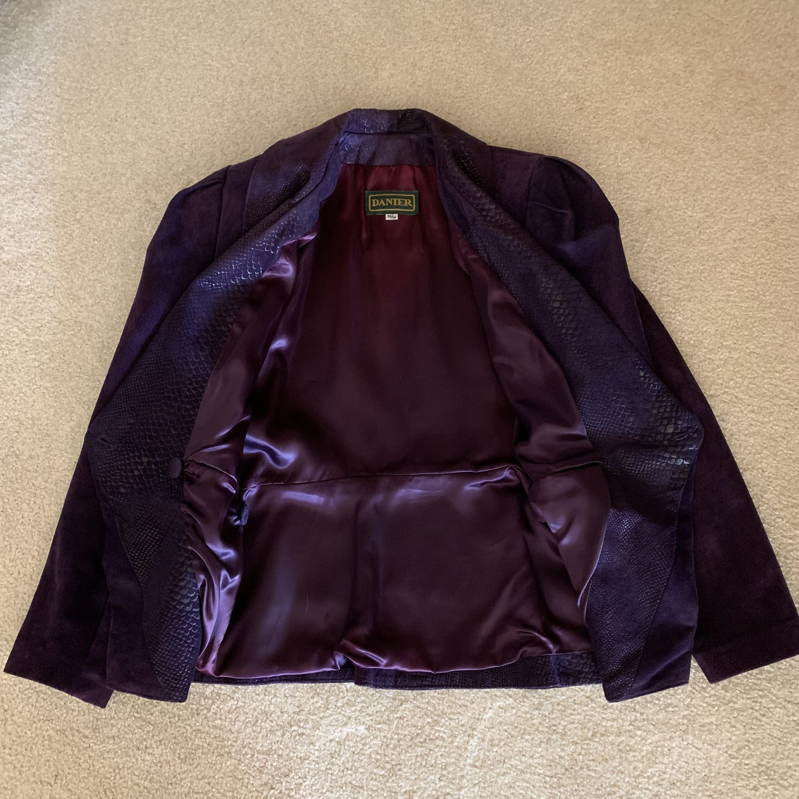 Tonal exotic-embossed leather is integrated at the lapels, pockets, cuffs, and lower hem, adding surface complexity while remaining deliberately understated. Fully lined in rich plum acetate, the interior construction reflects Danier’s reputation for vertically integrated leather production and precision tailoring during this period.