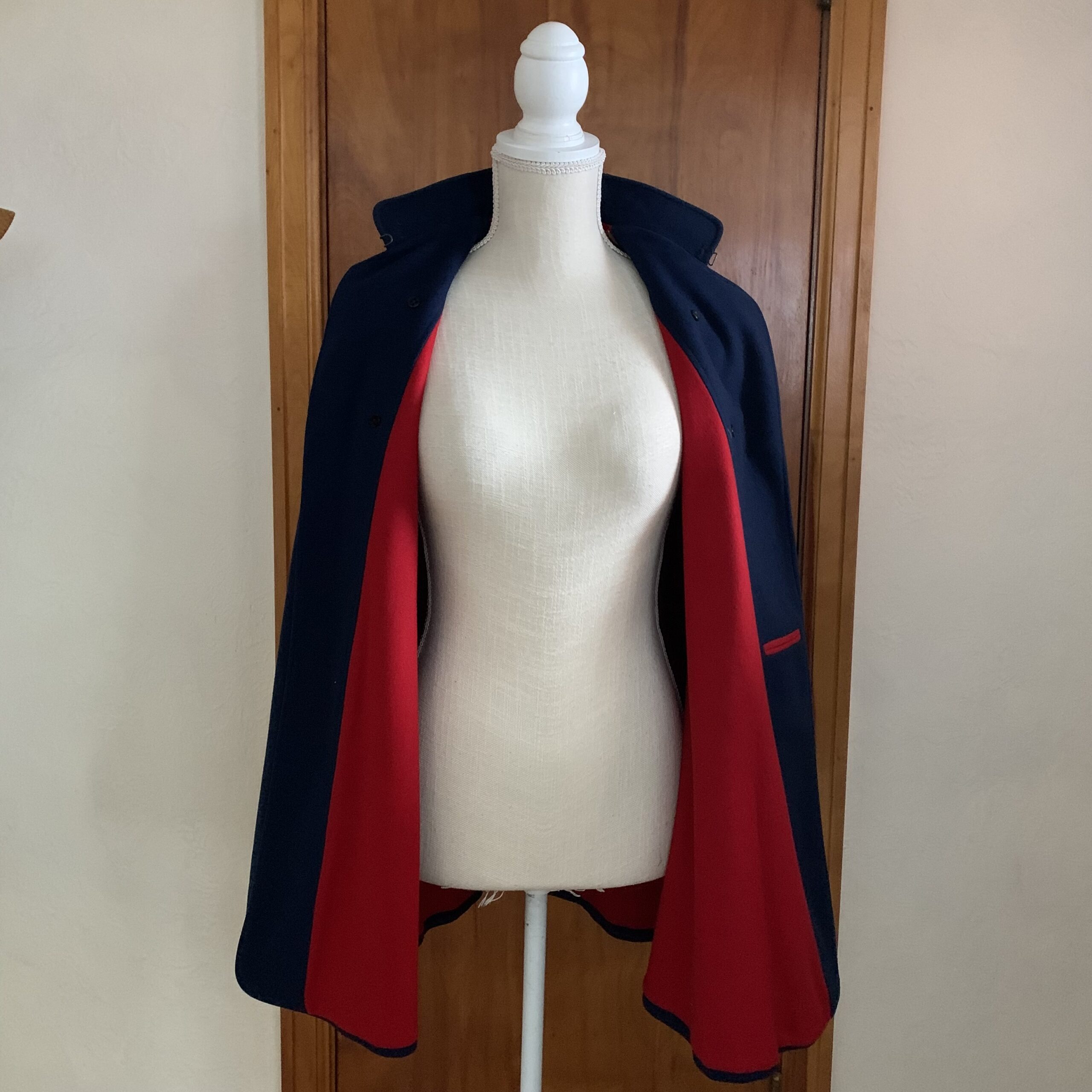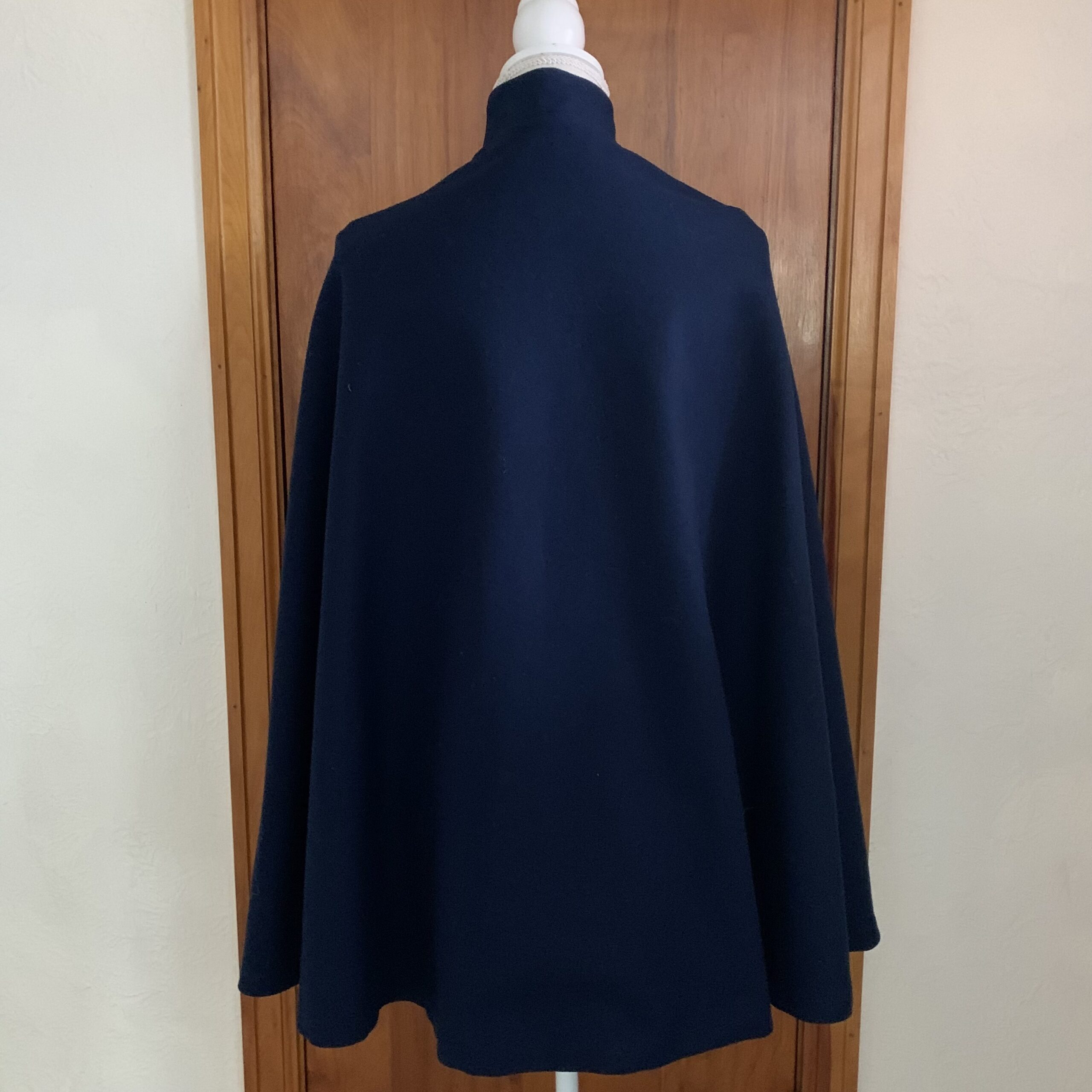 Condition: Excellent vintage condition with strong color and structure to the navy wool exterior. Two small moth nibbles are present on the interior lining, consistent with age and storage of vintage wool garments. These are confined to the inside and are not visible when the cape is worn.