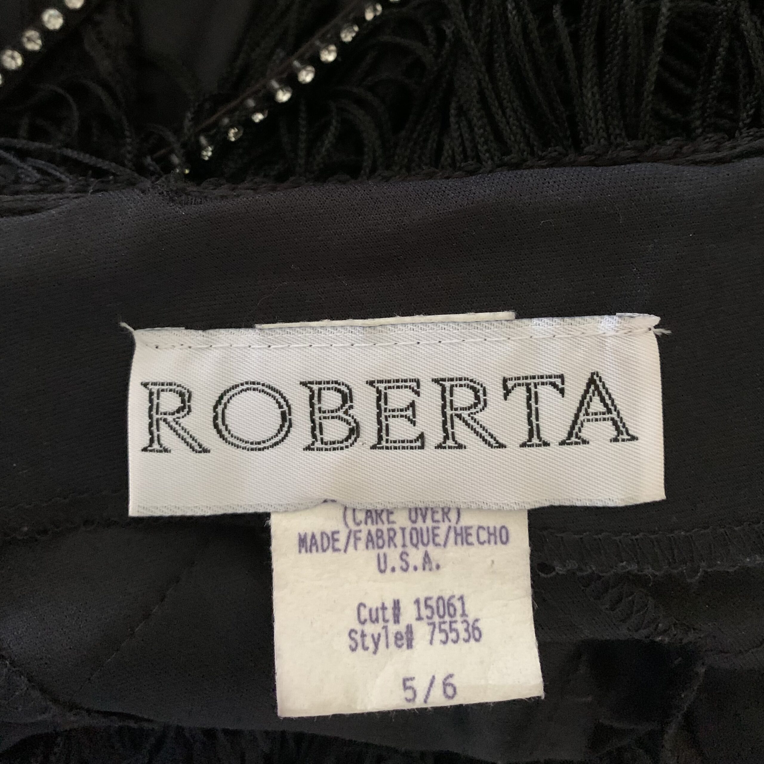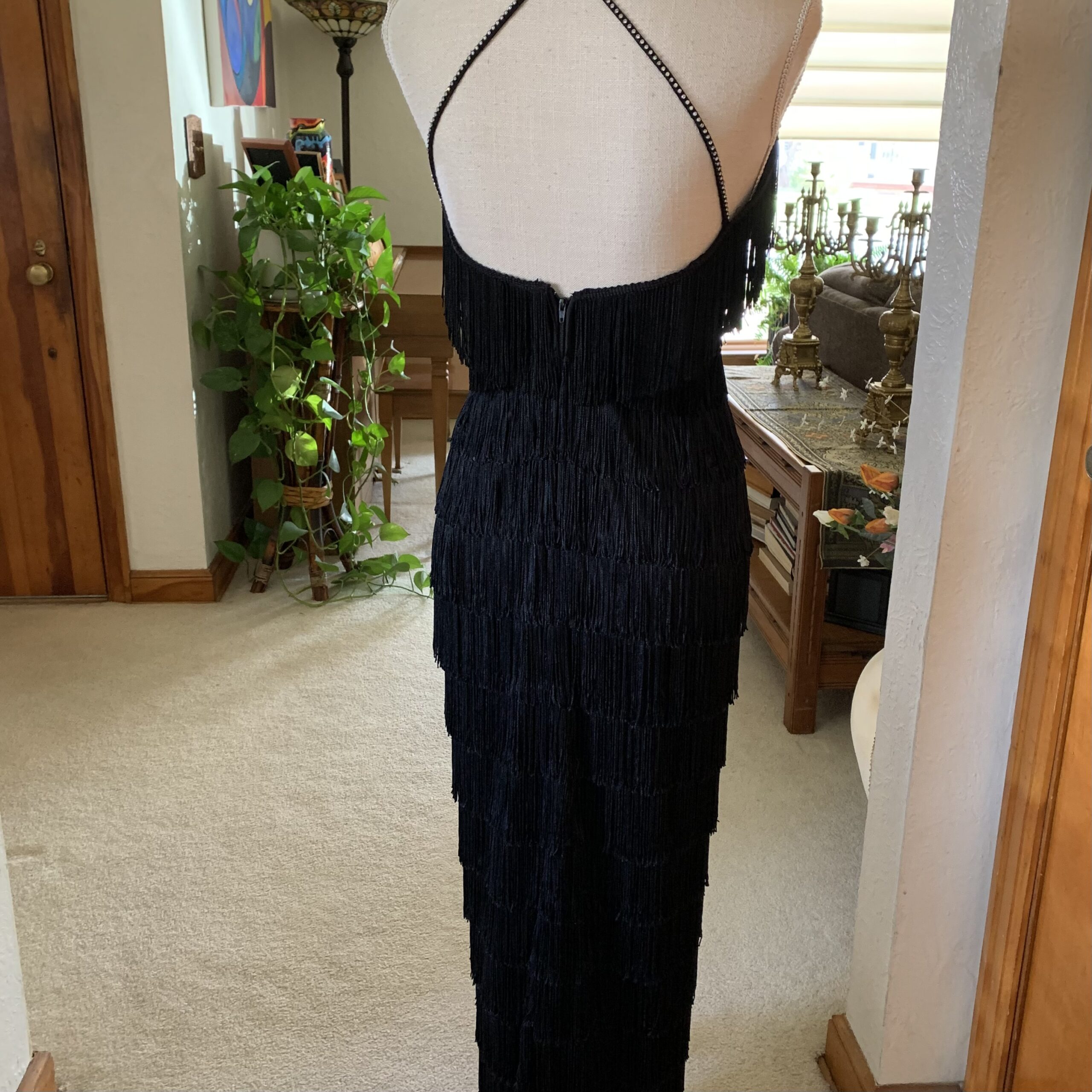 A full-length black column gown by Roberta, constructed in layered tiers of fine fringe that create continuous movement across the body. The silhouette is long and narrow, designed to elongate, while the surface shifts with every step.