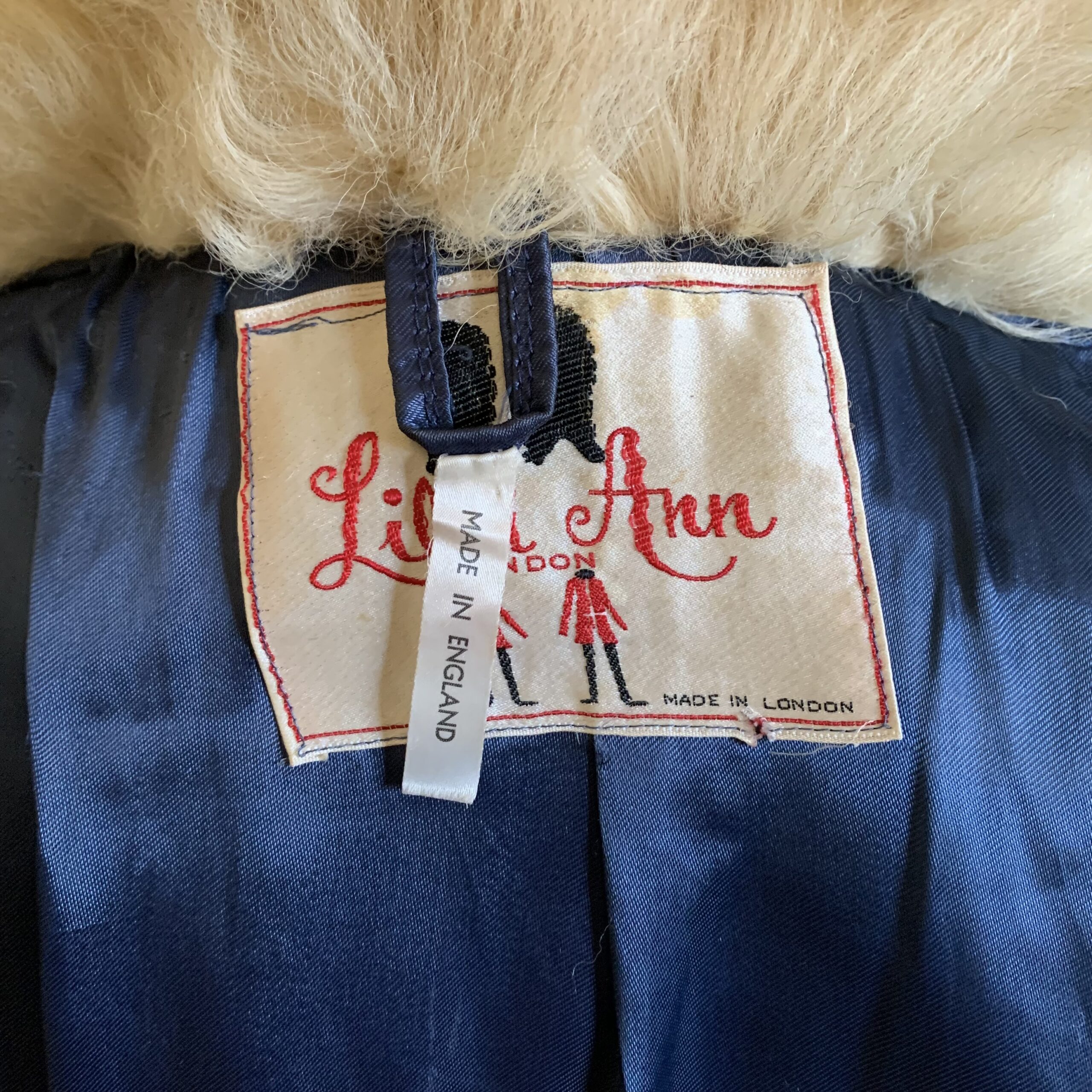 A dramatic oversized fur collar, plush cuffs, and a lightly flared mini-length silhouette create the perfect blend of mod London style and 1970s bohemian glamour. The coat includes a suede belt, front patch pockets, and satin lining.