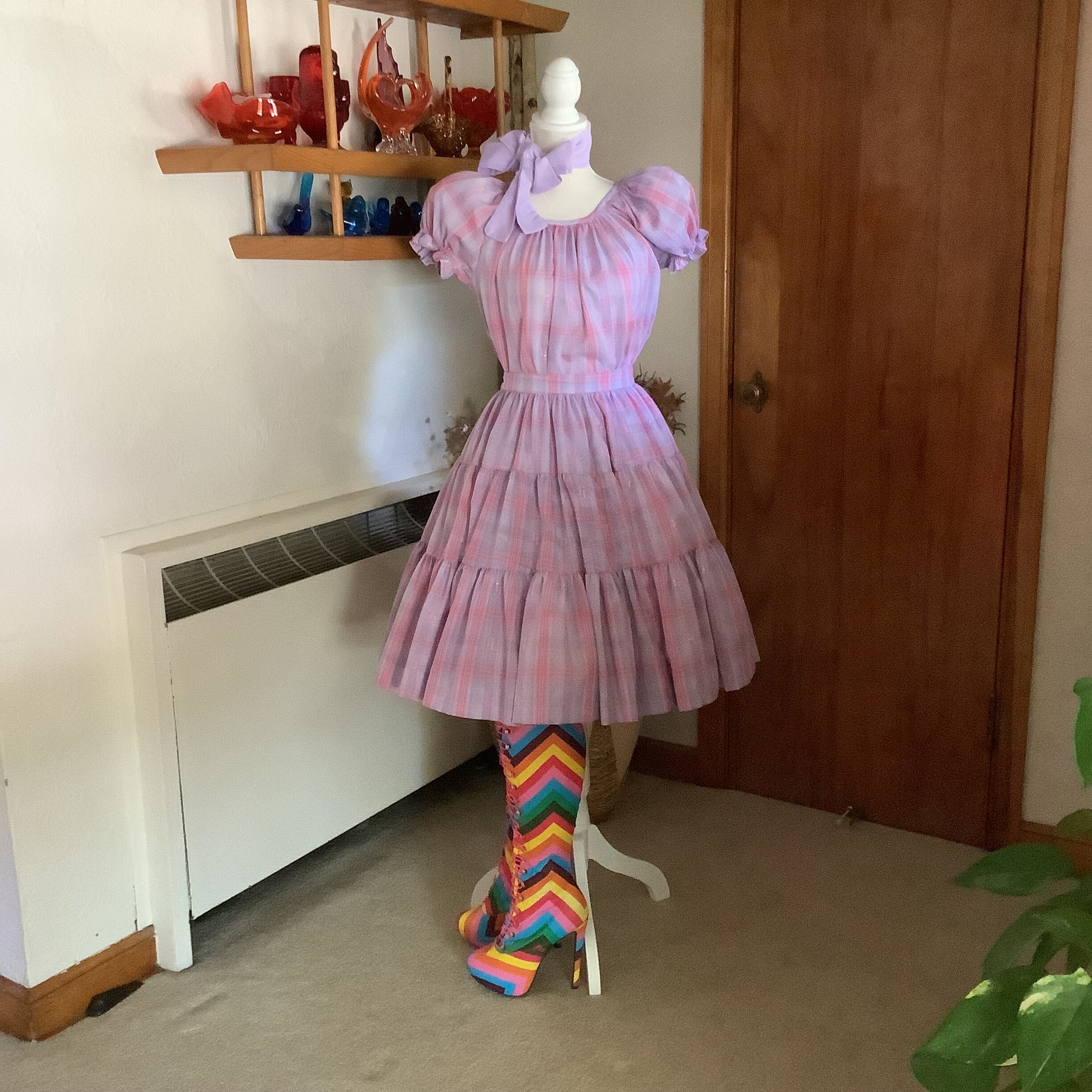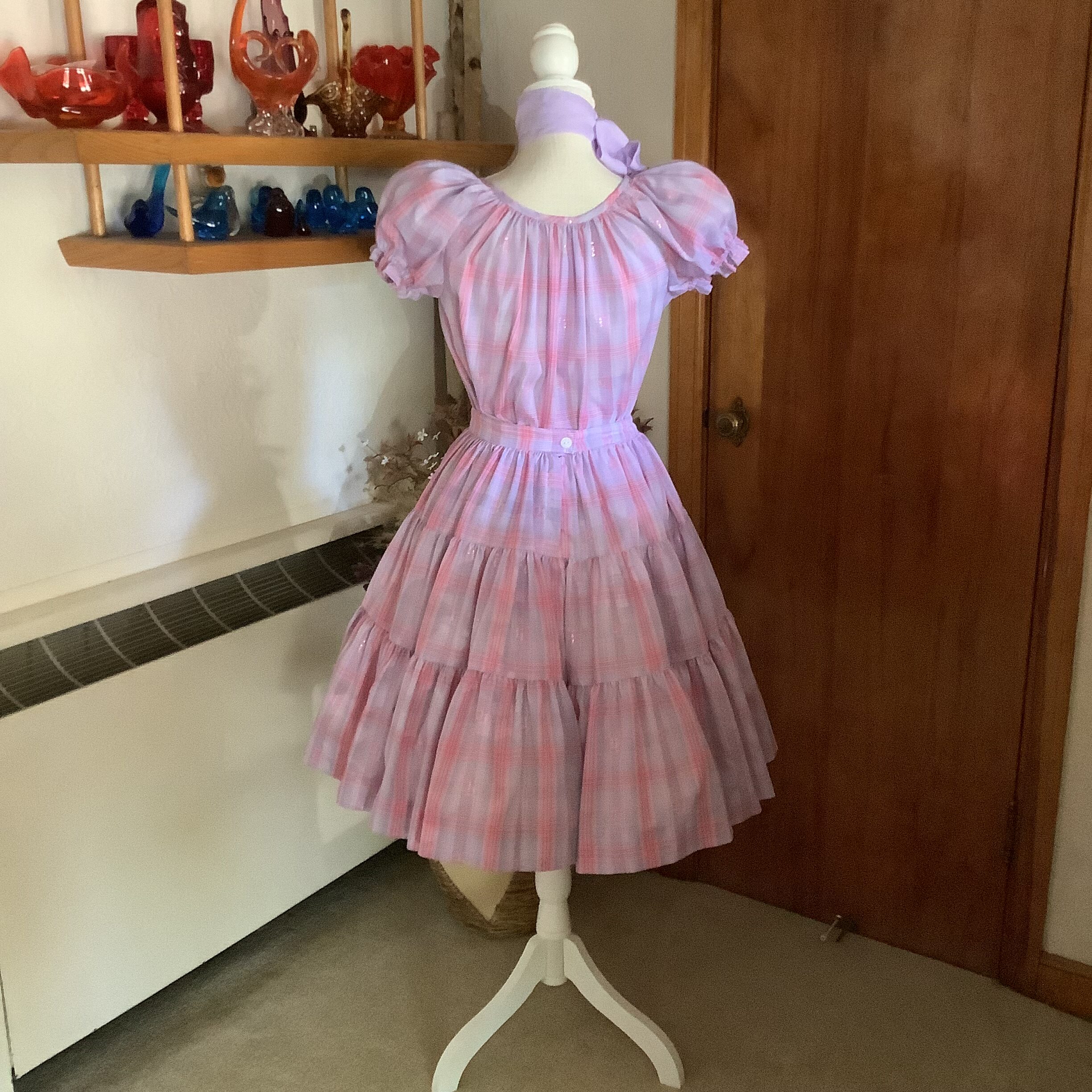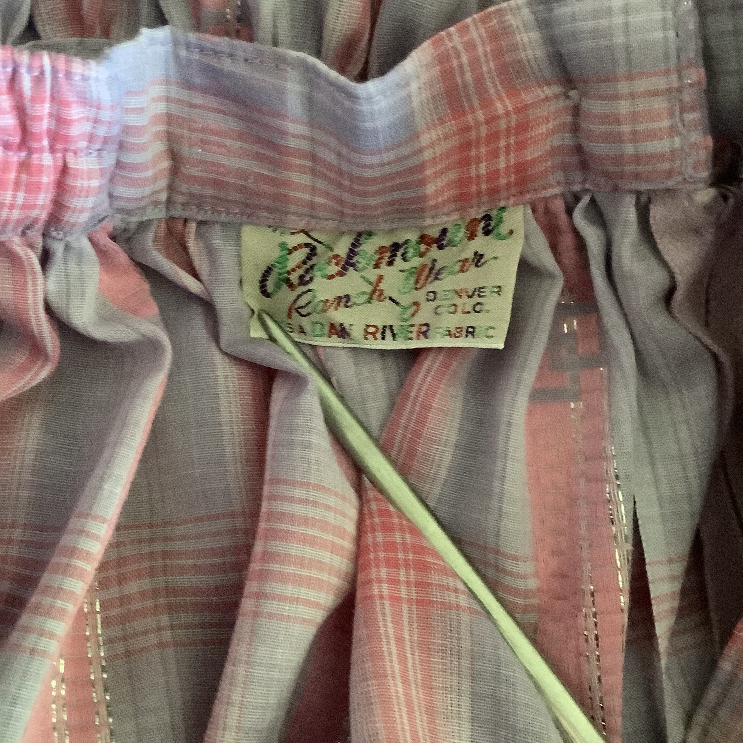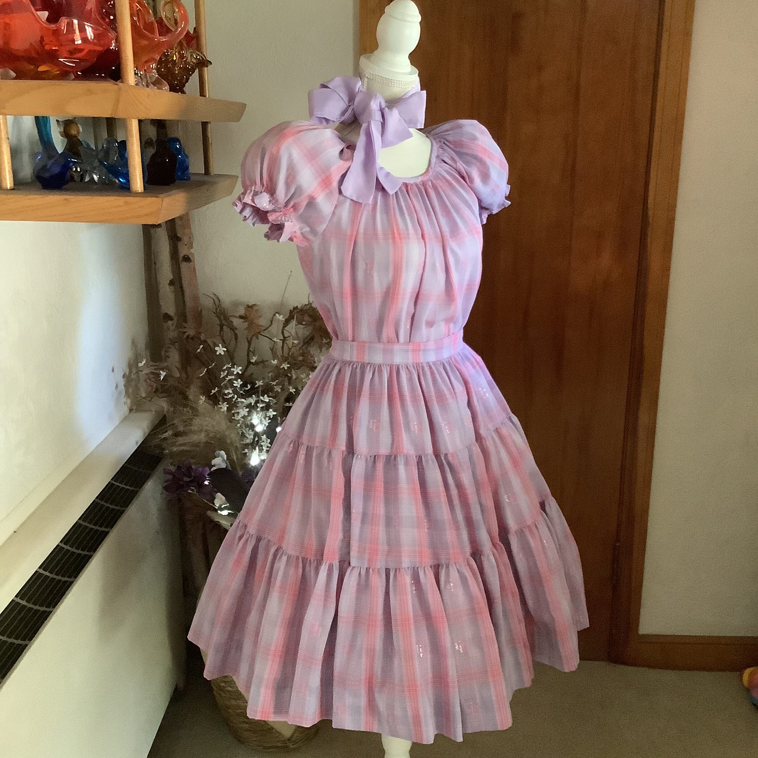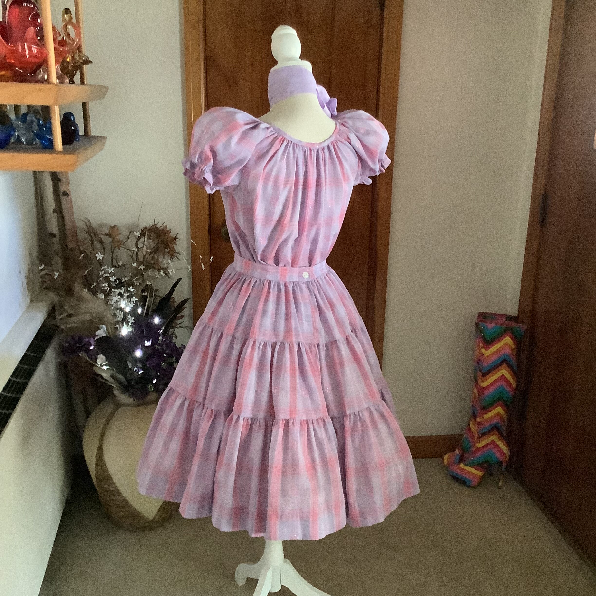 This lovely 1970s Rockmount Ranchwear two-piece set captures the soft, romantic spirit of the decade. Made from a lightweight lavender, pink, and lilac plaid with a hint of metallic shimmer, it features a pull on puff-sleeve blouse and a full, tiered skirt with beautiful movement.The skirt has a back button closure on the waist. It’s a rare and timeless piece from Rockmount’s Western heritage line—feminine, graceful, and unmistakably 1970s. A versatile set that can be worn a number of ways making it a practical ensemble. In excellent vintage condition with no flaws to note. Neck scarf, boots and petticoat shown on mannequin are not included. No size tag, refer to measurements below for fit.