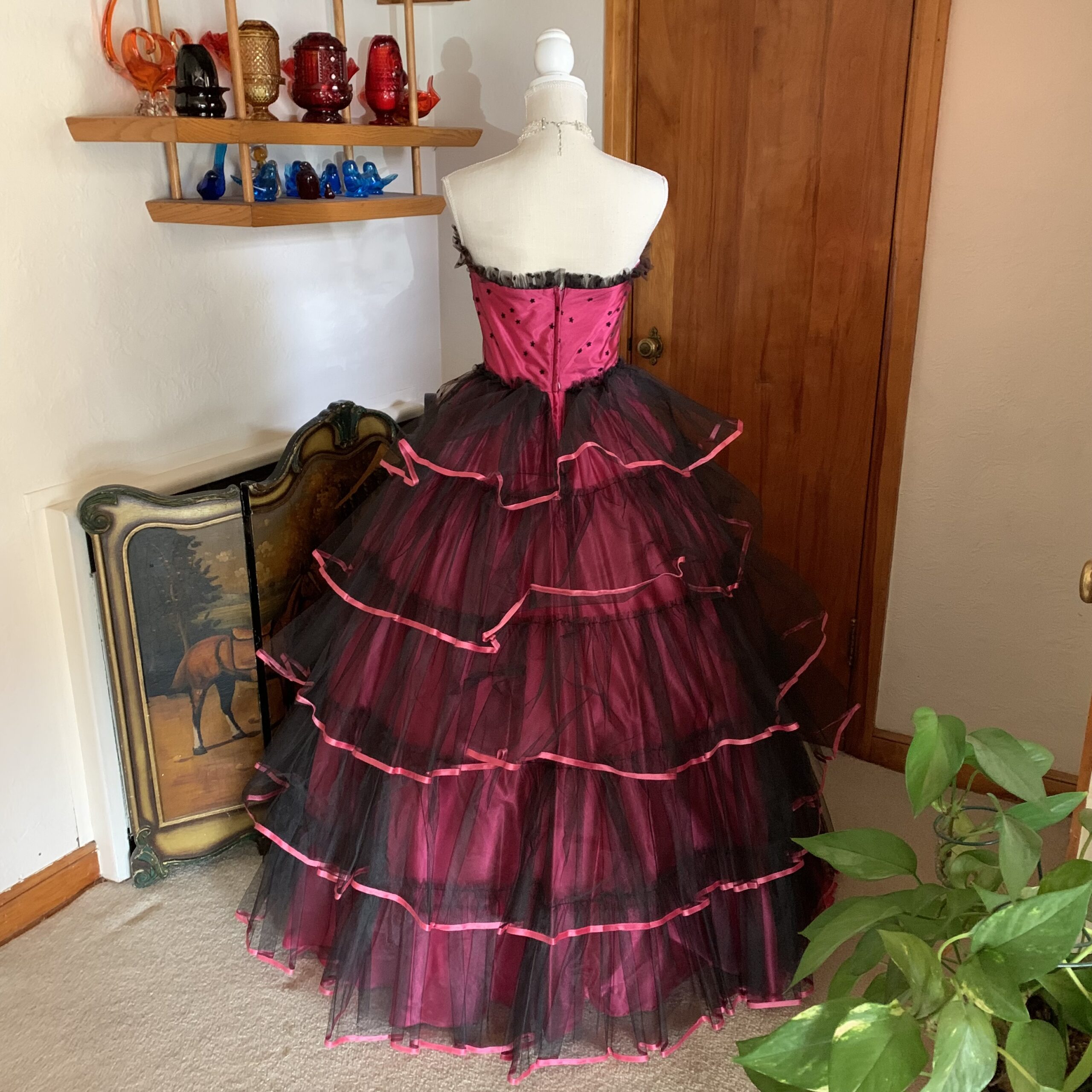 The bodice is fully structured with a sweetheart neckline trimmed in black ruffled tulle, which creates a flattering and feminine silhouette. The full, tiered skirt features cascading layers of black netting edged in pink ribbon, adding movement and volume. White tulle petticoat attached underneath. Item is shown on the mannequin with an additional petticoat to showcase the volume of the piece and is not included. Freshly dry cleaned and ready to wear.