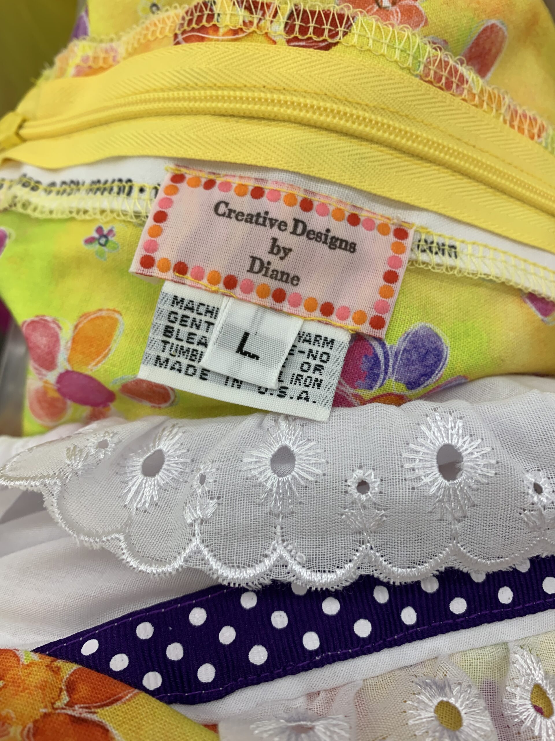 This sunny vintage prairie-style dress captures the playful spirit with its bright yellow floral print, crisp white bodice and deep purple ruffles. Features puffed sleeves, lace trim and decorative buttons. The full, layered skirt and contrasting ribbon accents add volume and movement, making it perfect for twirling in. Hidden back zipper closure. In excellent vintage condition with very little wear noted. Dress is shown over a petticoat underneath and is not included. Item has been professionally cleaned and is ready to wear Size tag reads large, refer to measurements below for fit.