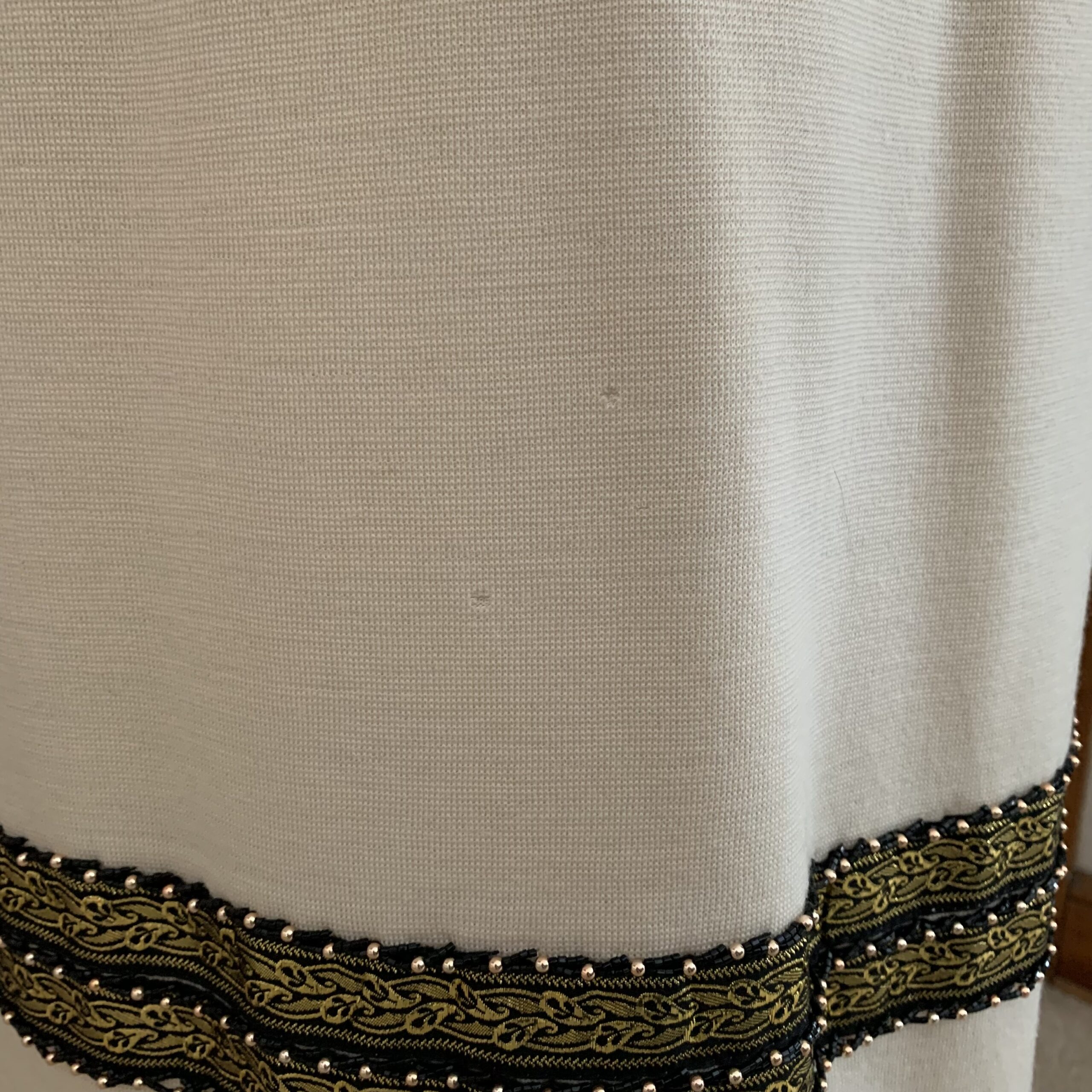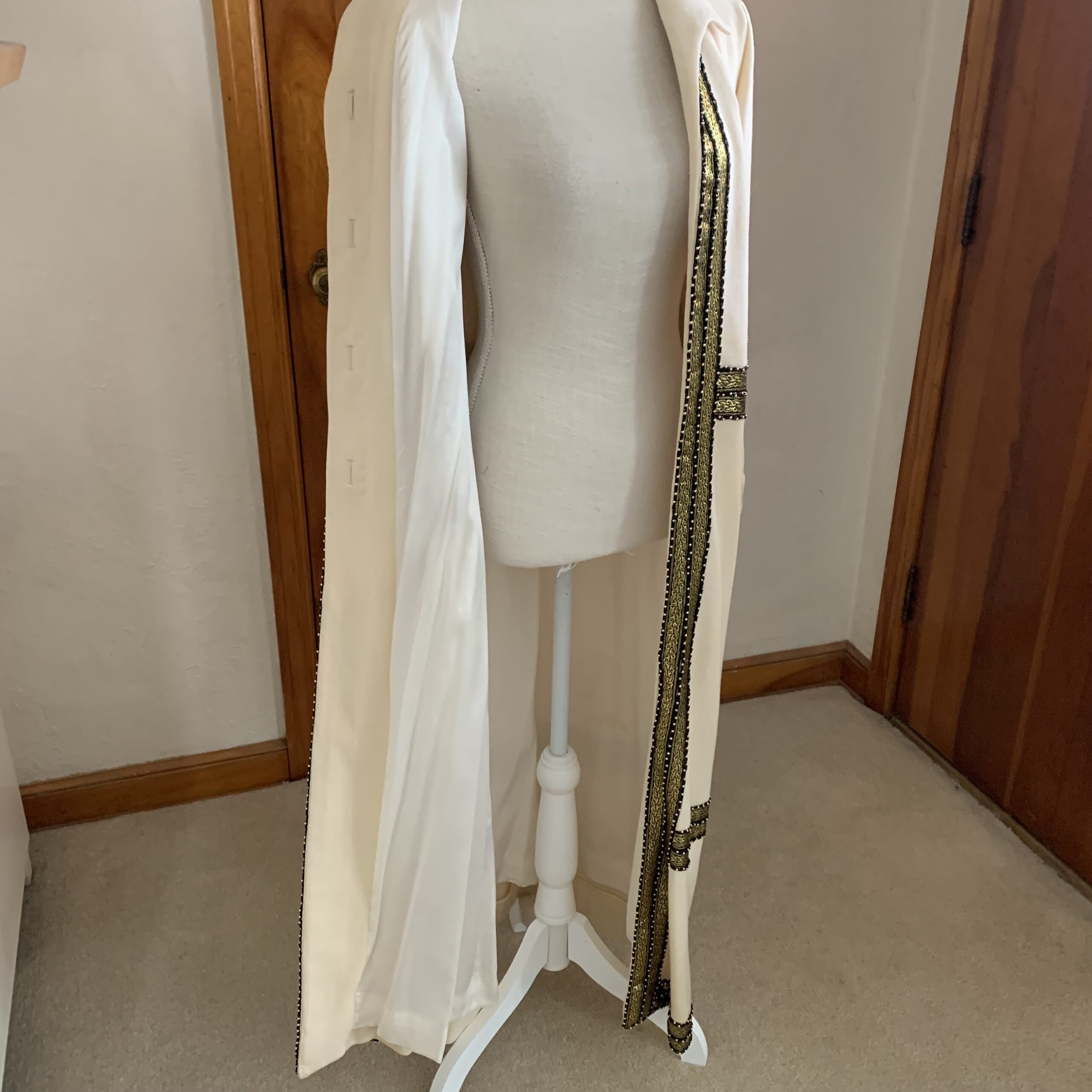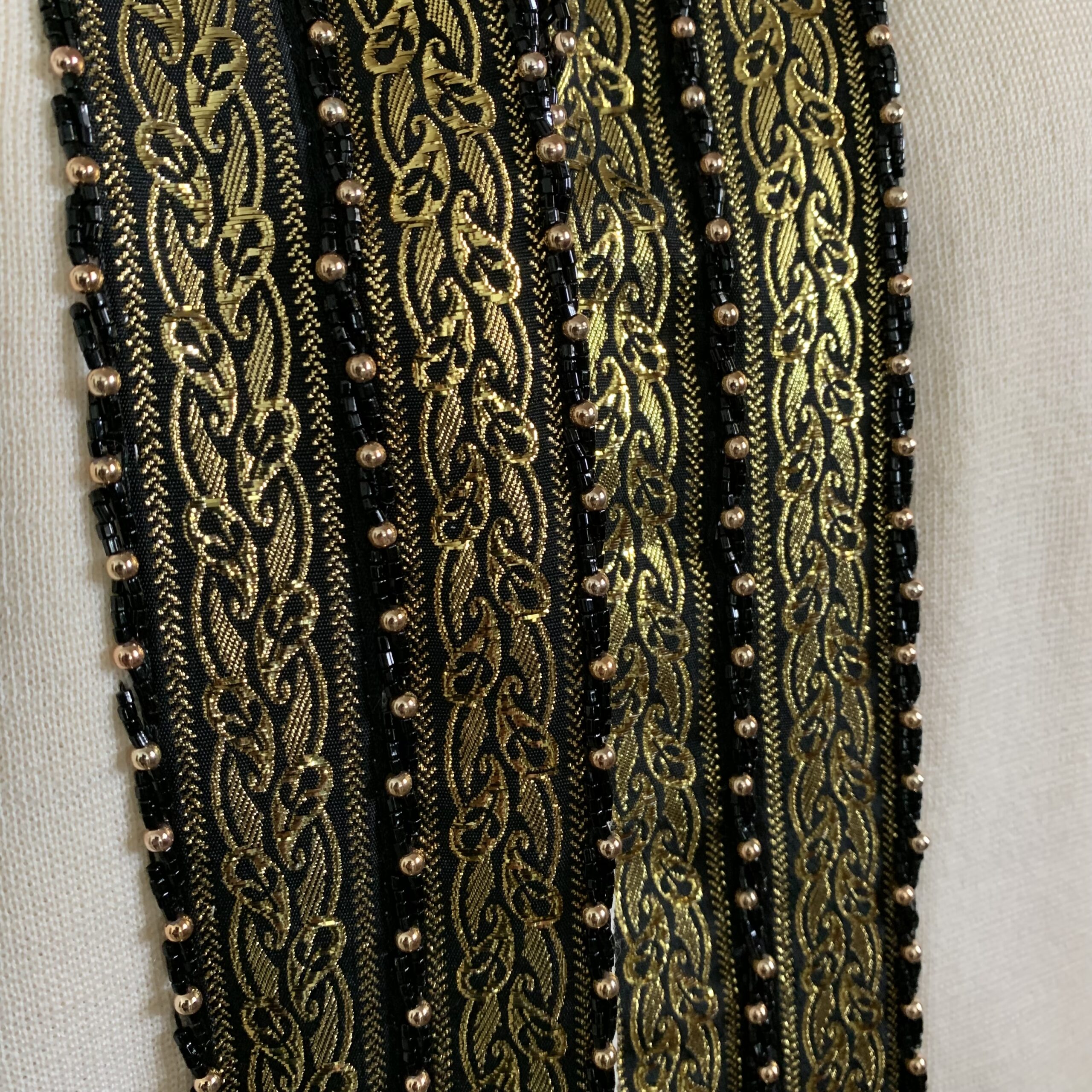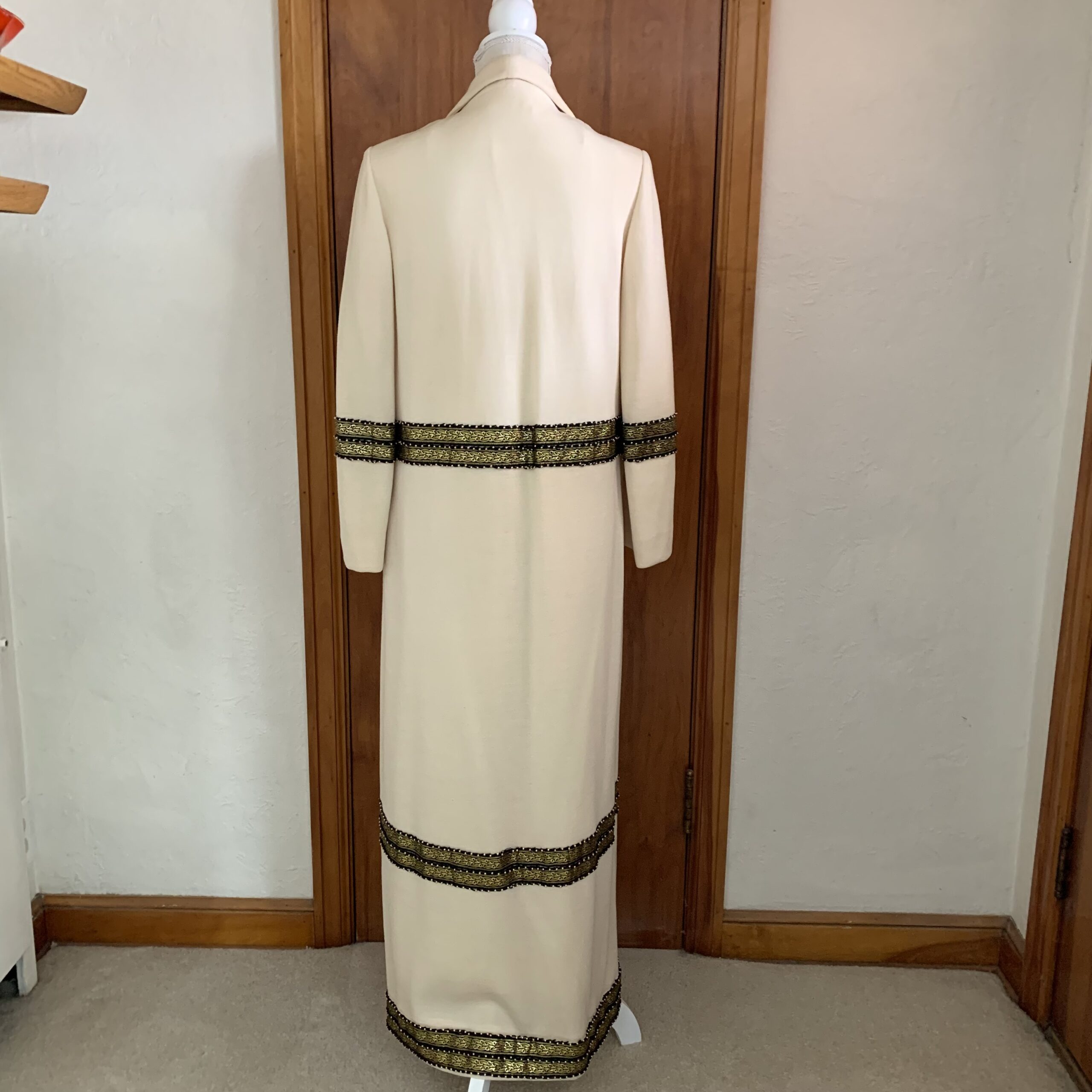 Tres Chic Imports offers this mid-century longline wool knit coat in a warm biscuit tone, trimmed with ornate black and gold metallic galloon and hand-applied beadwork. Designed as an open-front duster or hostess-style coat, the silhouette falls fluidly to full length, allowing the vertical trim to frame the body with quiet drama.