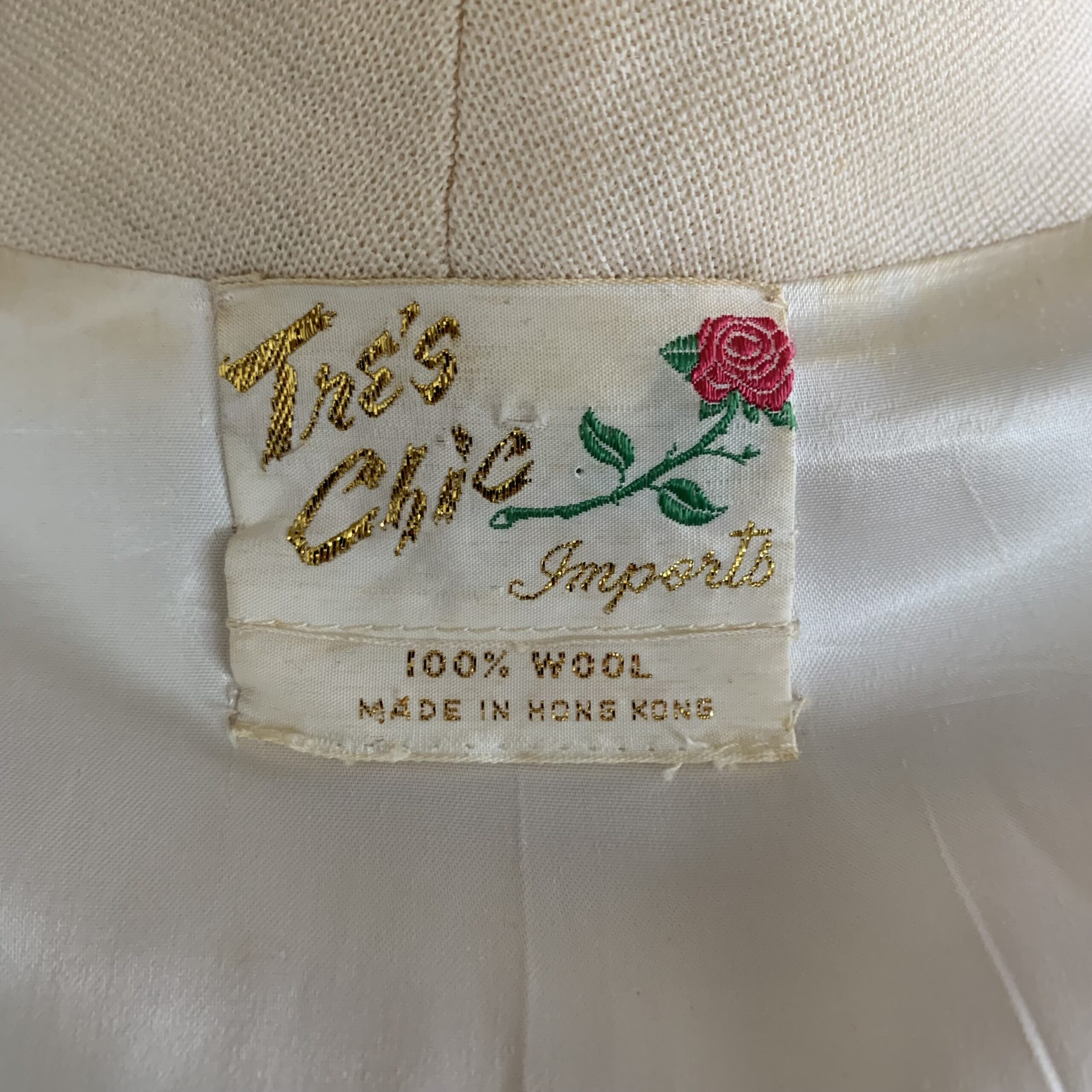 This coat reflects the mid-1960s moment when American and import boutiques embraced global decorative traditions—metallic braids, ceremonial trims, and beadwork—within modern, minimalist silhouettes. Produced in Hong Kong during the height of skilled wool knit manufacturing, the piece emphasizes material quality and embellishment over branding.